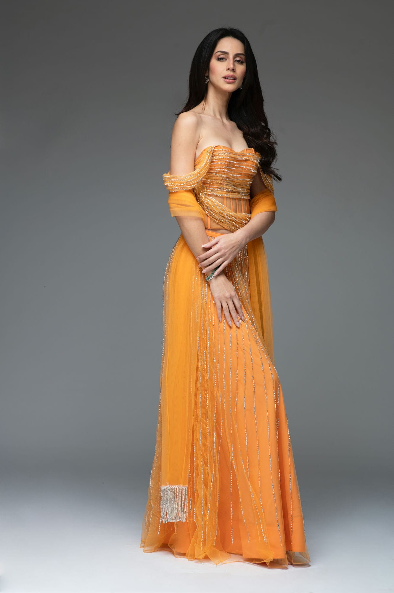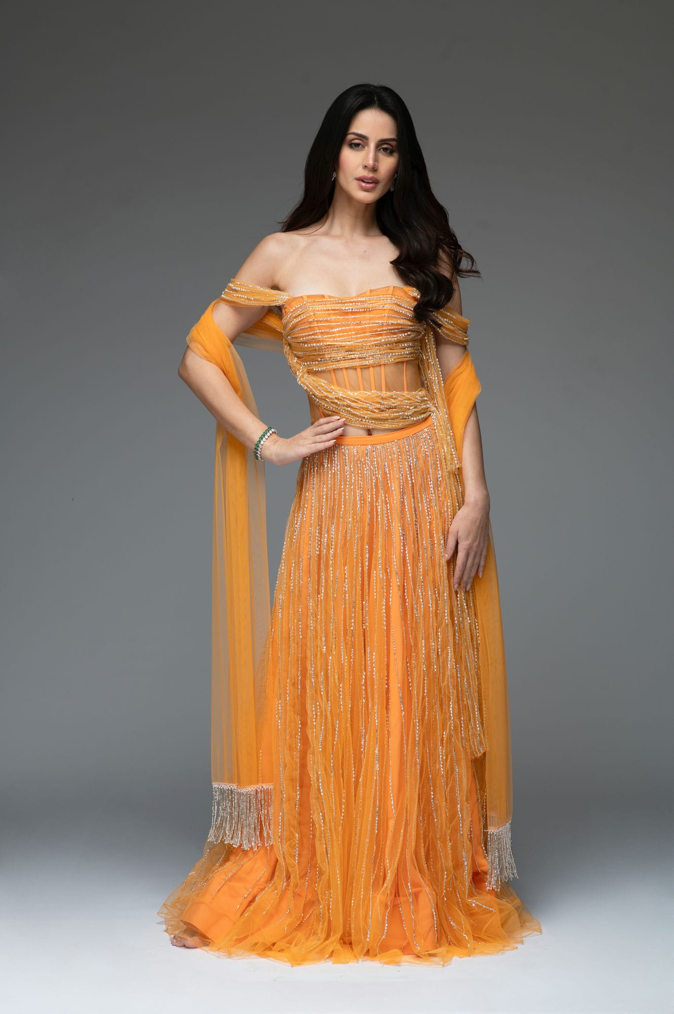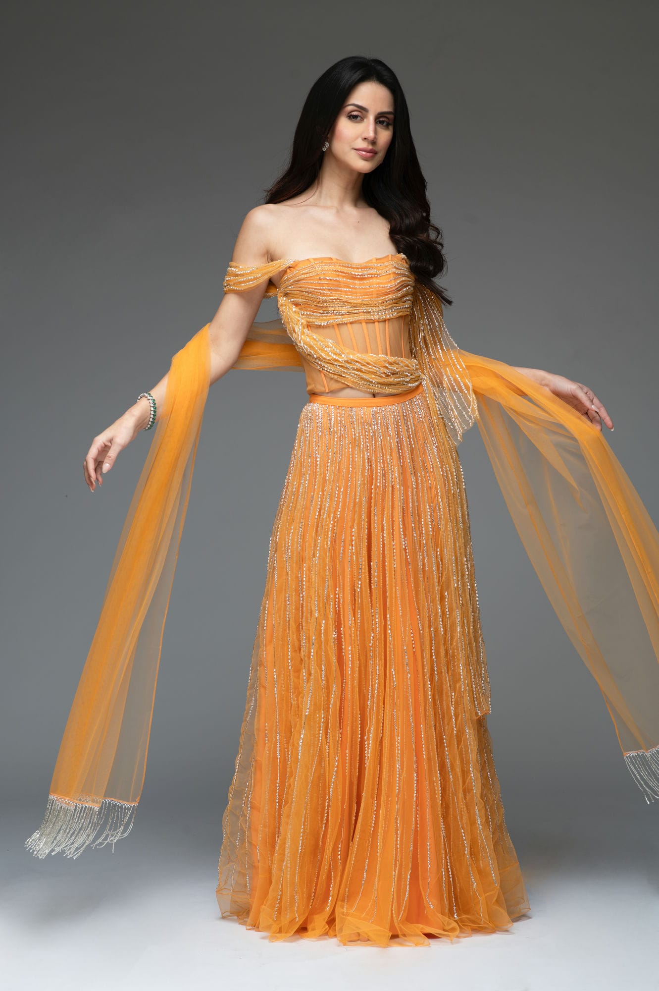 The Crystal Drape Set in a peachy tangerine.