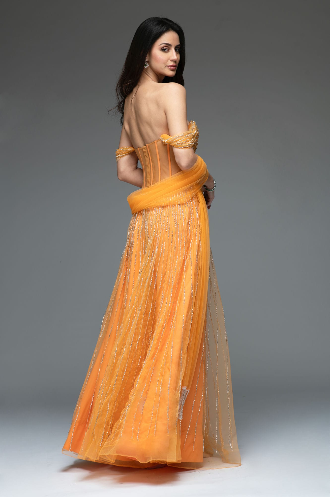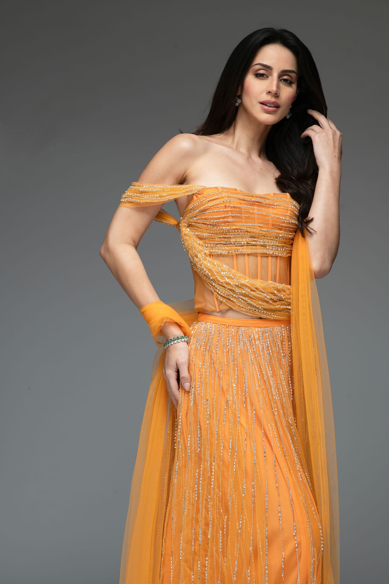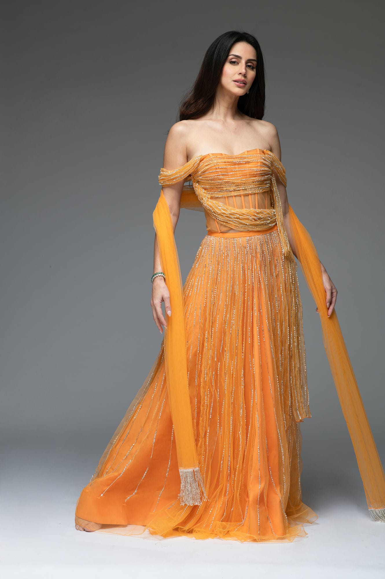 The Crystal Drape Set in a peachy tangerine.