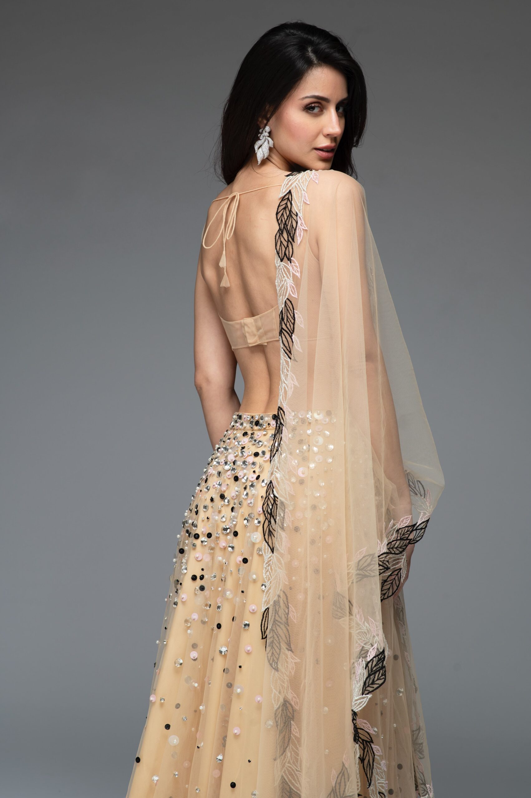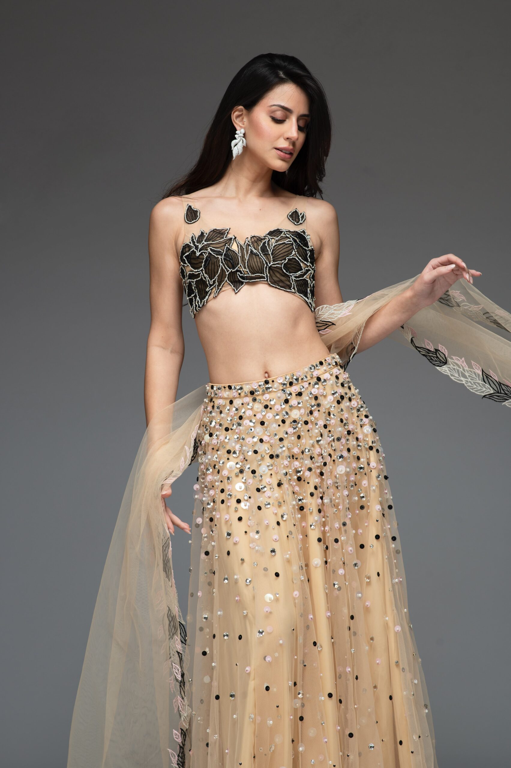 Colour of the lehenga and dupatta can be customised to black tulle on request, and more coverage can be provided in the blouse if needed.